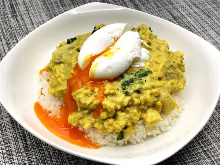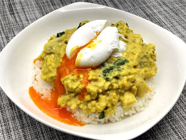 カレーだけでももちろんおいしそうなのですが、上にポーチドエッグを乗せて真ん中から割ると…黄身がトロっと流れ出してきて、とんでもなくおいしそうな見た目に大変身します!