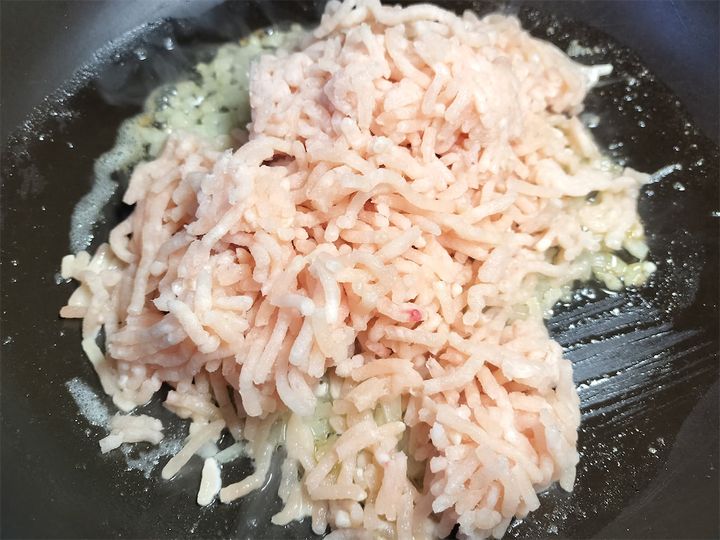 3. 玉ねぎに火が通ったら鶏肉を入れ、ほぐしながら炒めて焼き目をつけます。