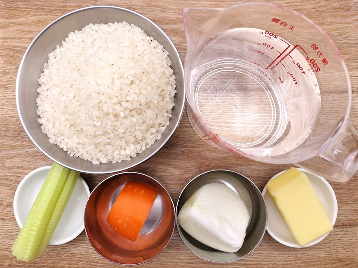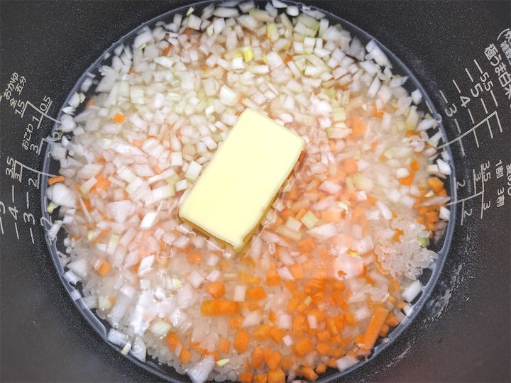 1. 炊飯器に米、バター、玉ねぎ、にんじん、セロリ、水を入れ、通常モードで炊き上げます。