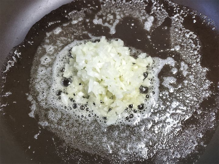 2. フライパンにバター15gを入れて中火で熱し、玉ねぎを炒めます。