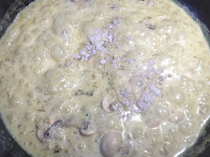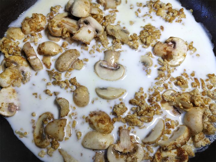 6. 牛乳を加えて一度沸かし、とろみがつくまで2~3分煮ます。