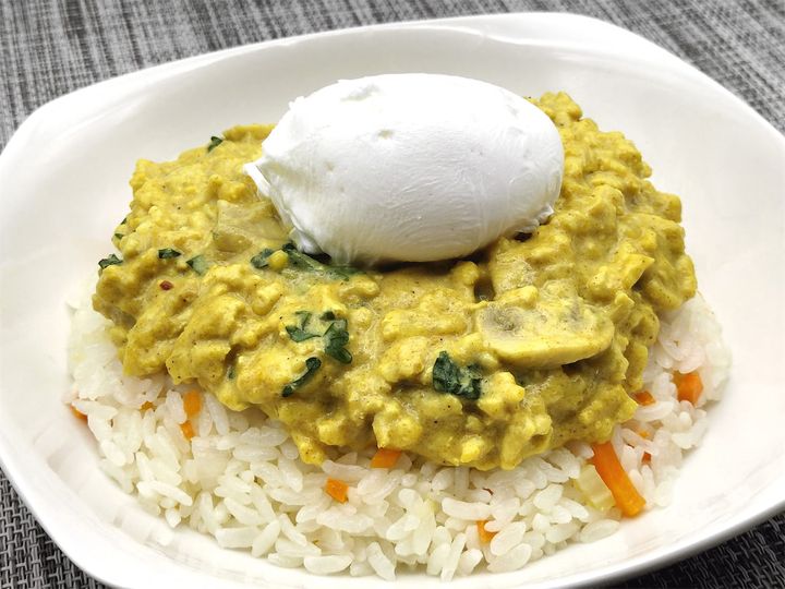 10. 1の炊き上がったバターライスをよく混ぜ、器に円形に盛り、真ん中に9のカレーをたっぷり盛ります。その上に作っておいたポーチドエッグを乗せて、出来上がりです。