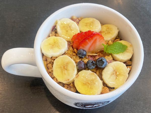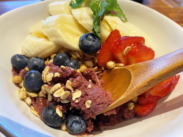 アサイーは甘めの味付けで酸味は控えめですが、ベリーの酸味で甘酸っぱさのバランスが取れていました。シリアルがたっぷりトッピングしてあるので、アサイーの冷たいまったりした食感とザクザクした口当たりが印象的なアサイーボウルでした。