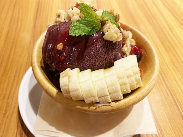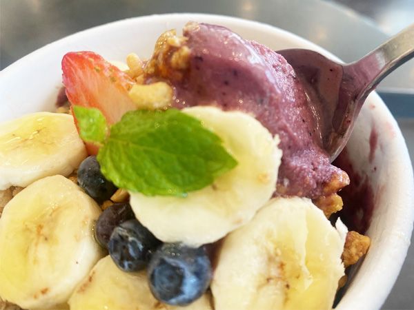 アサイーは甘さ控えめでほんのりの酸味。あっさりとした味わいです。バナナの甘さやベリーの酸味で、アサイーの味に深みが増しました。グラノラが冷たい口の中をやわらげてくれました。