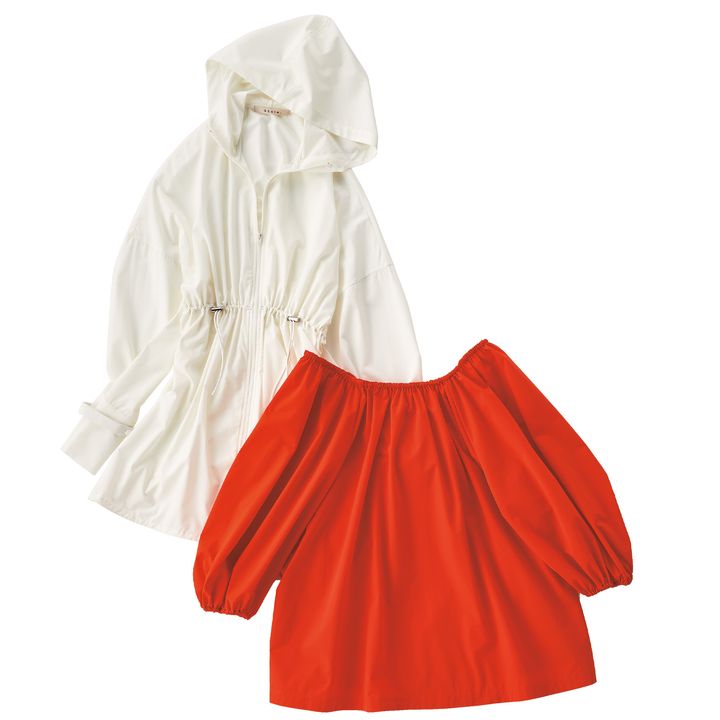 下:UVカット撥水接触冷感オフショルブラウス¥7,990(アンフィーロ/オンワード樫山)