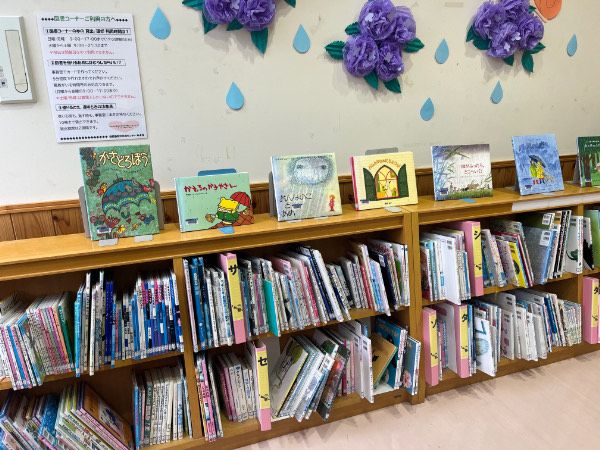 室内には図書コーナーがあり、新聞や雑誌、多くの絵本がおいてあります。