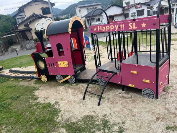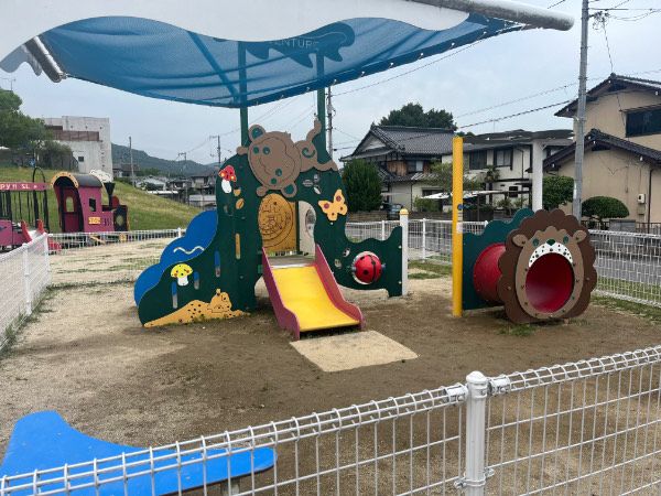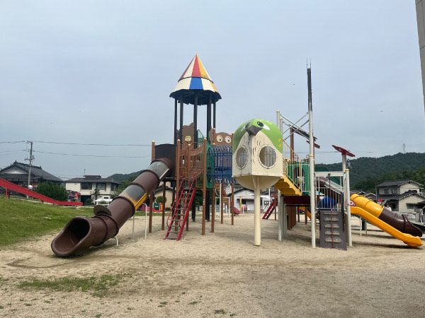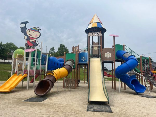まずは屋外の遊具から紹介していきます。 2017年に完成した遊具。熊野町観光大使の「ふでりん」が遊具にいる可愛い大型複合遊具があります。