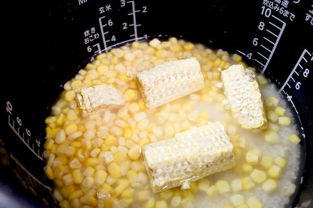 米3合に180g入りのコーンの缶詰を汁ごと投入し、塩をひとつまみ。後は残ったとうもろこしの芯を加えて炊き込みモードでスイッチオン!