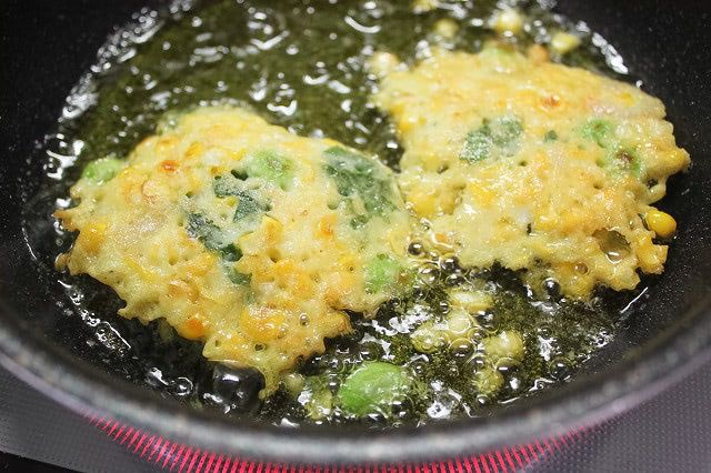 揚げ物が苦手なのでドキドキです!きつね色になるように片面3分ほどかけてじっくりと揚げました。とうもろこしや枝豆がポロポロと外れてしまいますが、気にせず揚げに集中します!