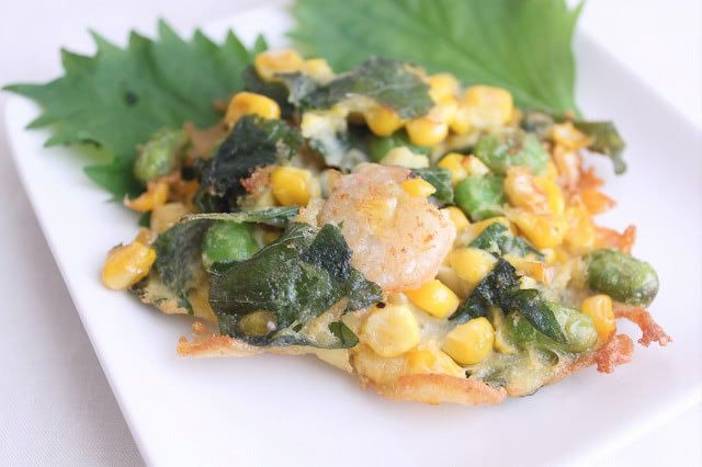 かき揚げの周りの衣がカリカリ!いや、ザクザクに近いかも。かなりしっかりとした歯ごたえです。具材が多い部分はカリカリではなくもっちり。これはとうもろこしの粒感とエビの食感のせいでしょうね。とうもろこしの甘さと青じその爽やかさを強く感じ、おいしいです。