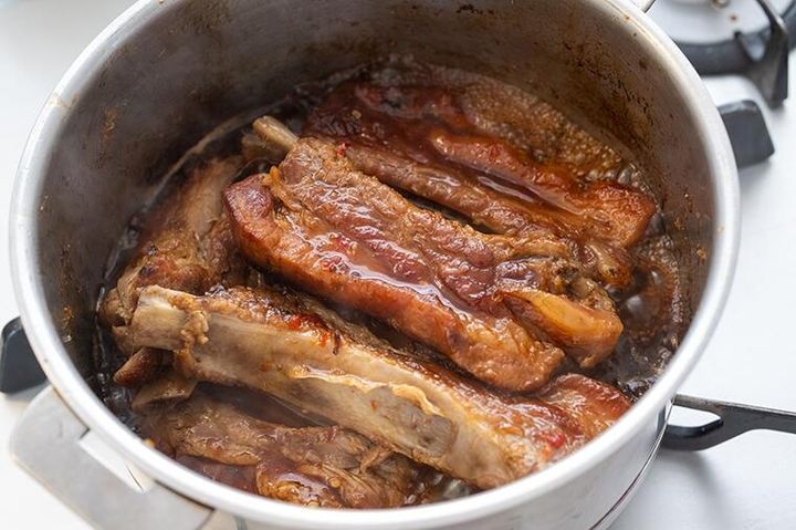 落とし蓋を外して、あと30分ほど煮る。このとき、煮汁がとびすぎていたら水を足し、常に煮汁がスペアリブの高さの半分ほどまで浸かっているようにする。全体にまんべんなく煮汁がしみるように、ときどきトングで返す。