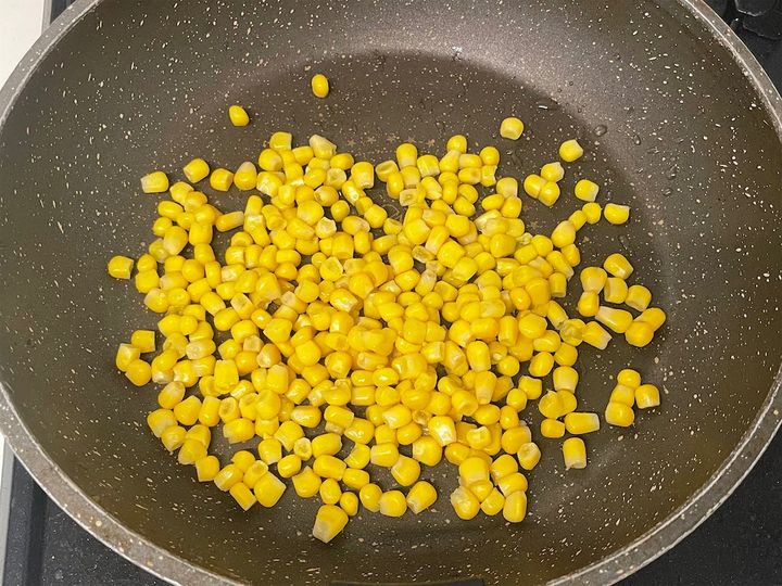 フッ素樹脂加工のフライパンにコーン缶を入れて、コーンに焦げ目がつくまで炒めます。
