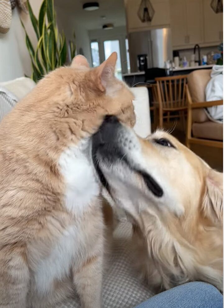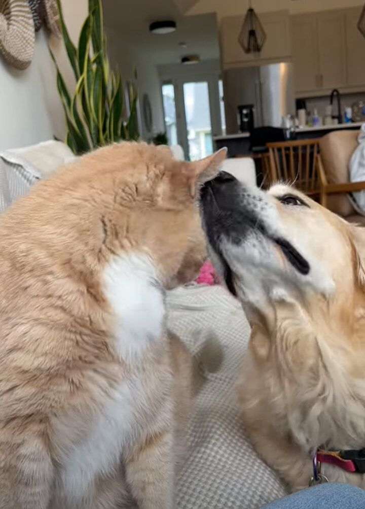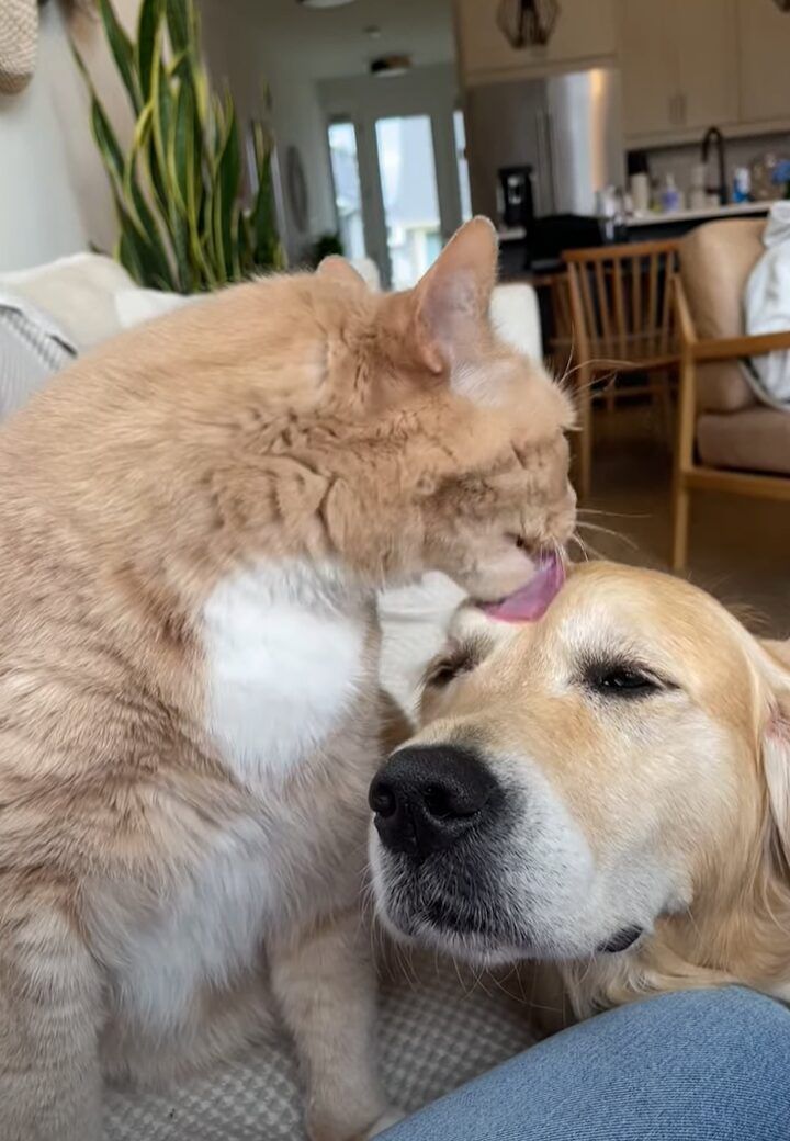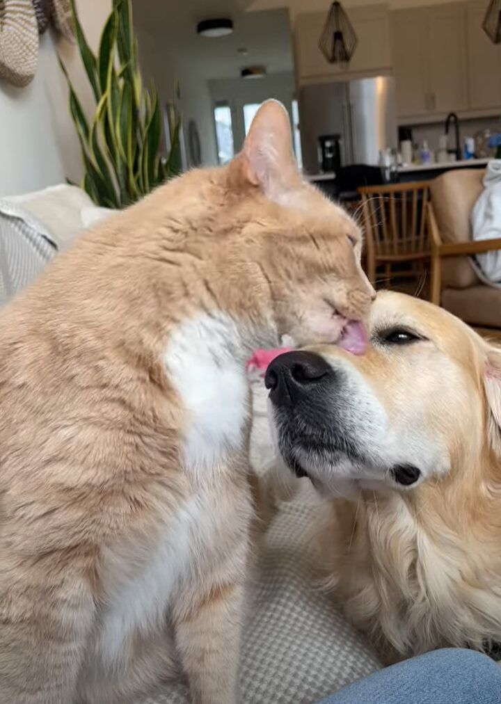 ソファに座っているネコが夢中でペロペロとなめているのは、同居しているゴールデンレトリバーの顔でした!