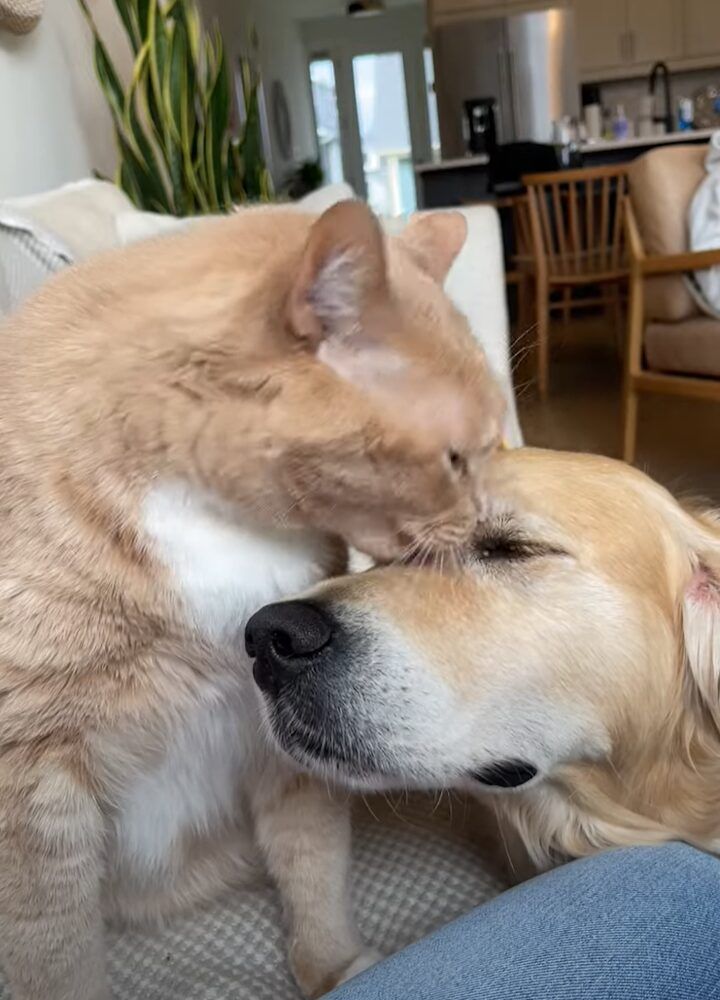 ゴールデンレトリバーの顔をペロペロ。夢中でグルーミングするネコがかわいい!!【アメリカ・動画】