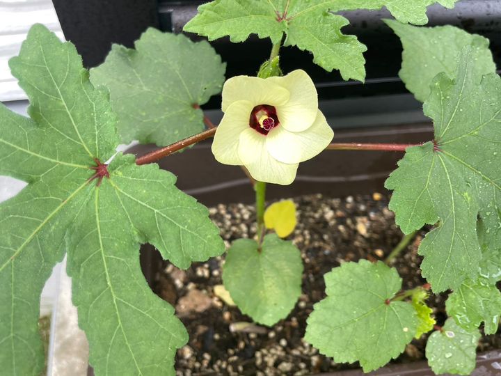 種をまく時期が遅かったのでまだ収穫はできていませんが、黄色の可愛い花が咲き、小さなオクラが成長中です。