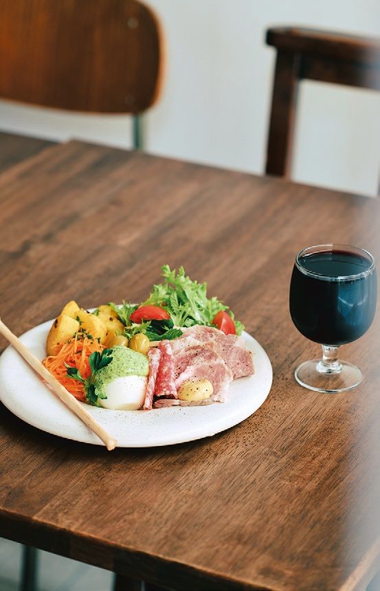 店主の増本泰斗さんは現代美術家。人々が自由に振る舞える場を作りたいという思いから『パルメラ』を立ち上げた。料理を手がけるのは妻で、食卓を豊かにする保存食を提案する『保存食lab』の奈穂さん。自家製ハムやウフマヨの「前菜盛り合わせプレート」¥1,500や「鰯フライとグリーンサルサ」¥700などワインを進ませる料理と、泰斗さんが暮らしたポルトガルの酒場流、たっぷりの「グラスワイン」¥600で昼からごきげんな時間を。
