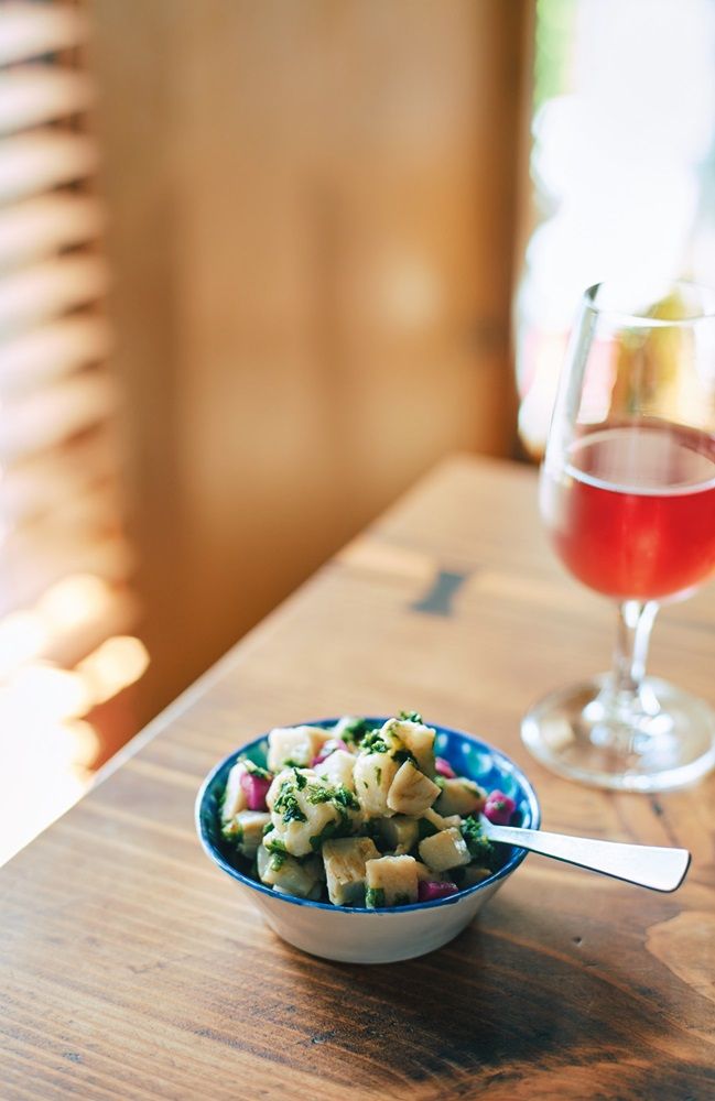店名は店主の高橋順子さんが姉妹の妹であり、芋が好きなことから。そんなエピソードを聞くだけで、ゆるやかな空気感が伝わってくる。パティシエとして長くタイで暮らした高橋さんは、帰国後にナチュラルワインに開眼。気取らず飲めるワインと、現地仕込みのタイ料理やスイーツを揃え店を構えた。「コイモサラダ」ハーフ¥400、グラスワイン¥800~。チーズたっぷり、ワインとの相性もいい「パルミジャーノのプリン」¥600も人気が高い。