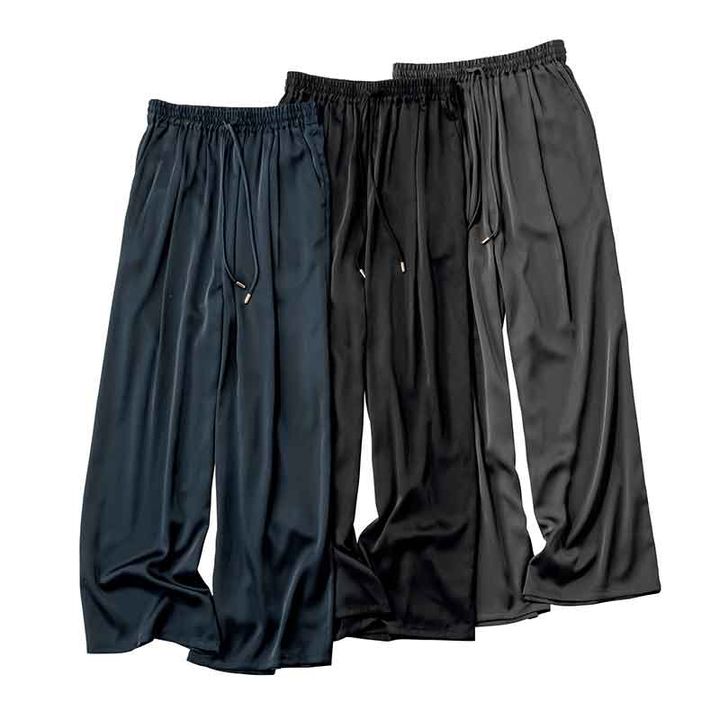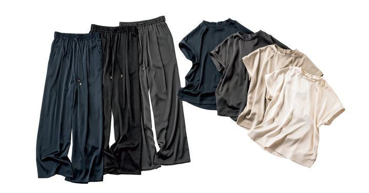 快適なイージーパンツも 微光沢サテンならきちんと感UP