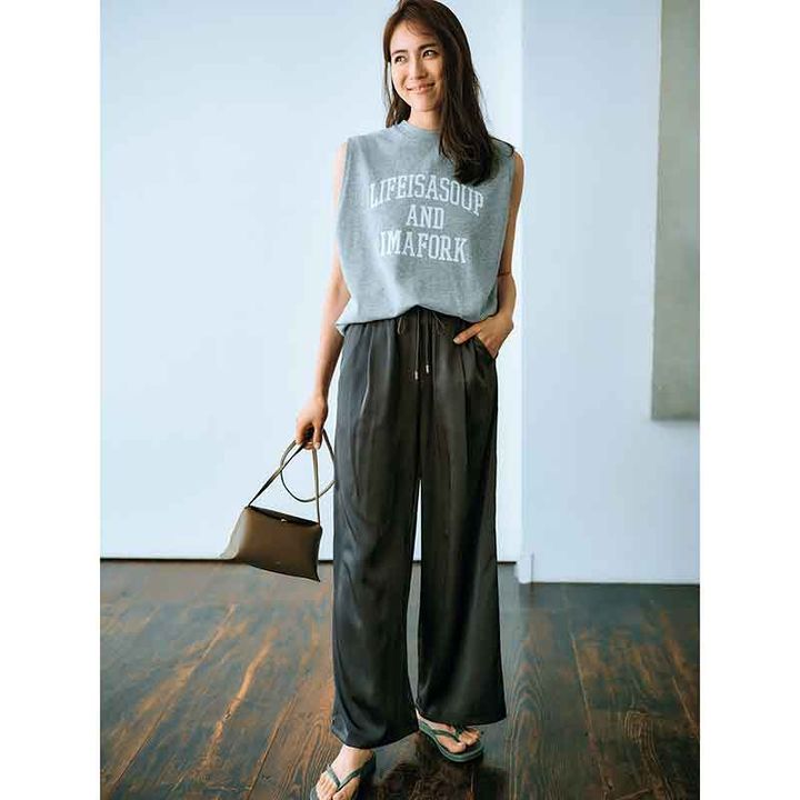 パンツ¥12,100(エマテイラーSTYLEDOOR)トップス¥14,300(マイカアンドディール/マイカアンドディール恵比寿店)バッグ¥27,500(TOV/アンソロジー)サンダル¥2,750(イパネマ/シードコーポレーション)