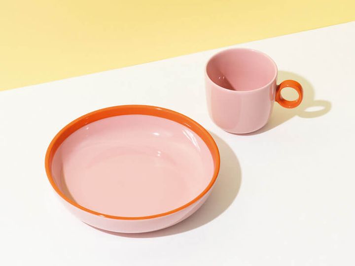 イッタラ プレイ マグ(ピ ンク・オレンジ)¥4,950、イッタラ プレイ ディーププレート(ピンク・オレンジ)¥5,280 /ともにイッタラ