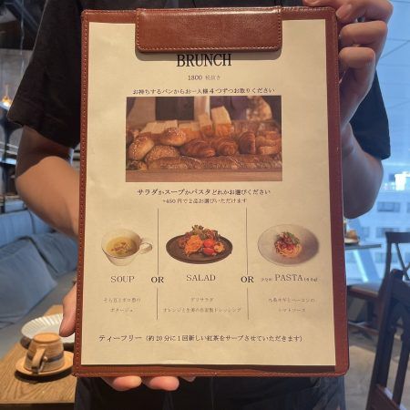 ブランチはメインをスープ・パスタ・サラダから選び、さらにたくさんの種類のパンの中から4種類をチョイスできます。