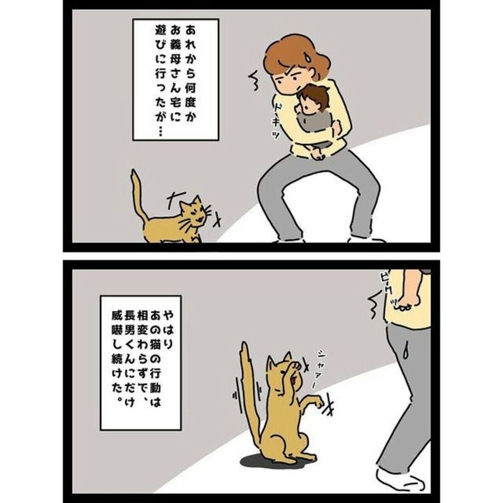 義母宅に行くと、猫がいつも息子を威嚇してきます。そのため、うさぽさんも子どもを連れて義母の家に行くことに不安を抱えています。