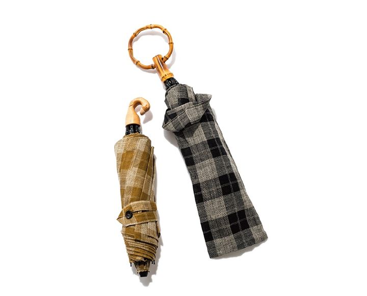 生地に麻を100%使用した折りたたみ日傘は、上質な光沢とナチュラルな風合いが持ち味。サイズは47cmと55cmの2種類から、ハンドルは竹や天然木、アクリルなど多くの種類からチョイスできる。各¥27,500(大森商店 TEL:03・3863・6414)