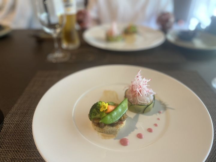 自家農園で栽培された新鮮な野菜やハーブ、知夫里島で水揚げされた魚介類など、採れたての食材を贅沢に使用したコース料理は目にも華やかで、口に入れる前から嬉しくなってしまうものばかり。もちろん、口に入れればもっと嬉しくなってしまうのだけれど。