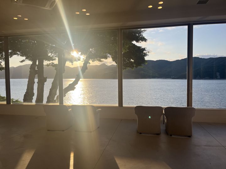 窓を広くとったロビーからは、ジオパークのなかにいるかのような風景を楽しめます。ロビーのソファに腰掛け、周囲に広がる静けさと眼前に広がる島前カルデラの風景をただただ眺める。時の流れを感じながらゆったりと過ごすなんて、いつぶりだろう…。季節変わればまた新たな表情を見せてくれるのでしょうね。