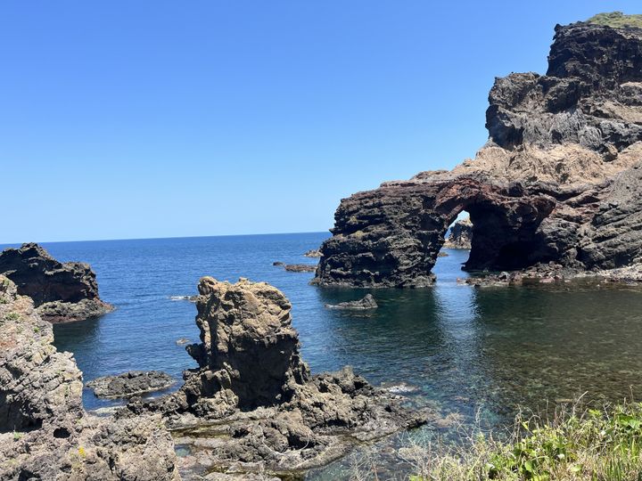 長い年月による海蝕作用で洞窟部分が崩落し、橋のようにアーチ状に残された奇岩は、さながら隠された秘境への入口といった雰囲気です。