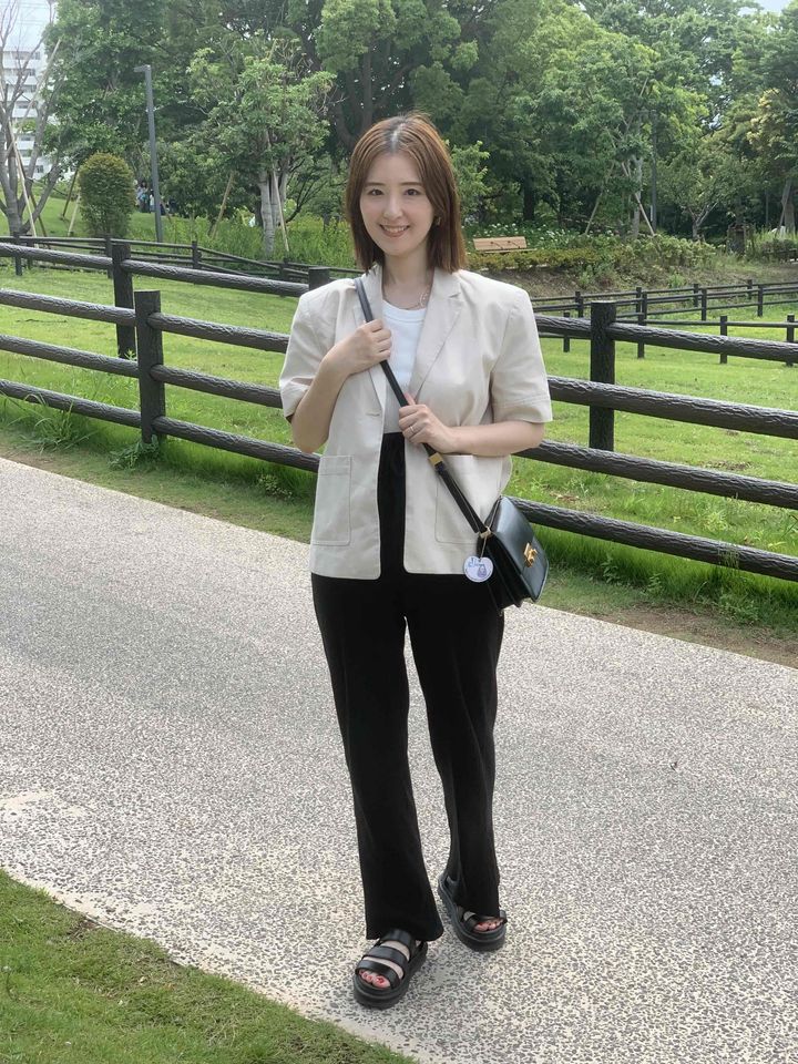 「一人目の妊娠中はトップスインを避けていましたが、海外のマタニティスナップを見ていたらあえてラインを出すのも素敵だなと思い、挑戦してみました。黒ボトムスなら膨張せず、ジャケットを羽織るとお腹も目立ちすぎないのでカッコよく着こなせるような気がします。パンツはマタニティ用なので、月齢に応じてウエストの調節をして最後までインしたコーデが叶いそう」