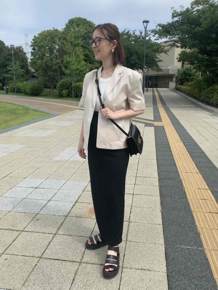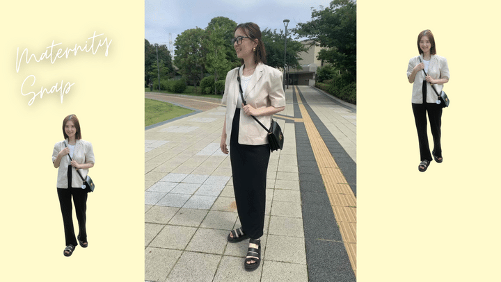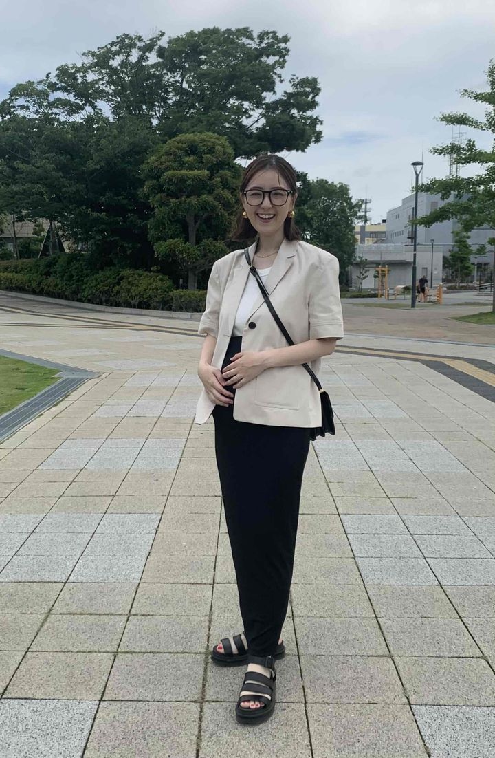 「一見同じコーデですが、実はボトムスをスカートにし、それ以外を着回したのがこちら。妊娠中はふんわりトップスでお腹をカバーしがちですが、今回はタイトスカートにも挑戦!ジャケットがあれば妊娠中のウエストマーク初心者にも安心でした。ネットブランドにはマタニティ服のバリエーションが想像以上に多く、ほかにワイドパンツも購入。妊娠前からフラットシューズやスニーカーが多かったので足元の変化はなかったのですが、ストラップ付きのサンダルが履きづらくなり避けるように。ドクターマーチンのサンダルは、妊娠中もスタイルアップできるのでこの夏愛用中です」