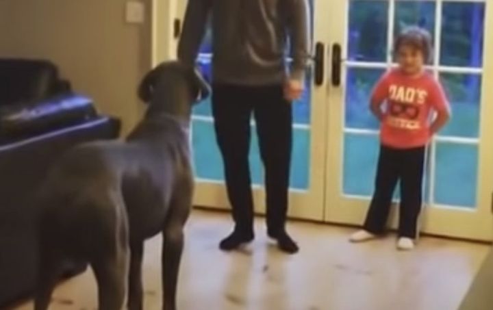 僕も一緒に運動するワン!飼い主さんの動きを真似する犬さん。
