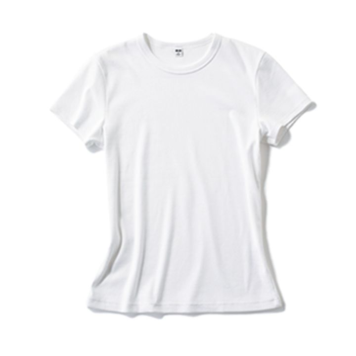 心地よく体にフィットする、コンパクトなリブT。首元が詰まっているので、きちんとした印象に。Tシャツ¥1,500(UNIQLO)