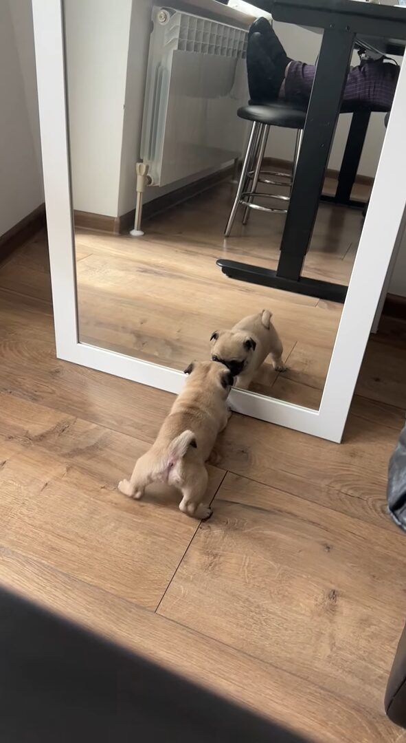 子犬が走ると、もちろん鏡の中の子犬も一緒に走ります。 その様子は、子犬が鏡の中で一緒に動く自分の姿を追いかけているみたいです。