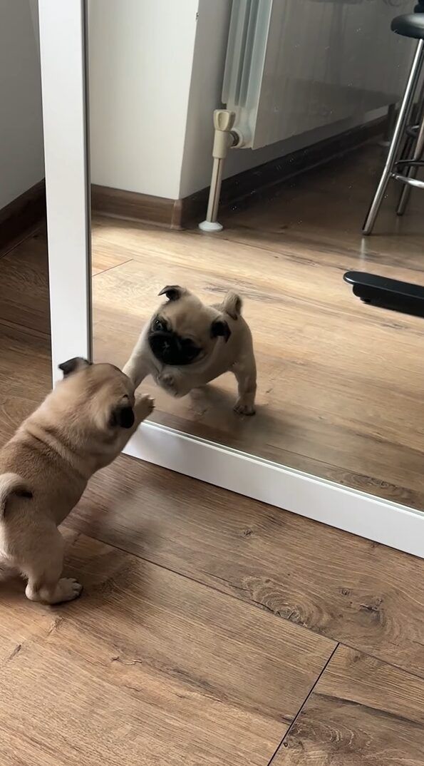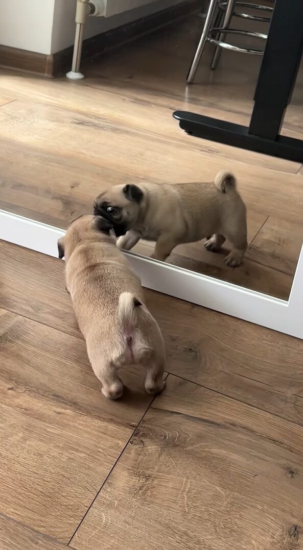 お友達と遊んでいるつもり?子犬が鏡に写る自分とわちゃわちゃ!!