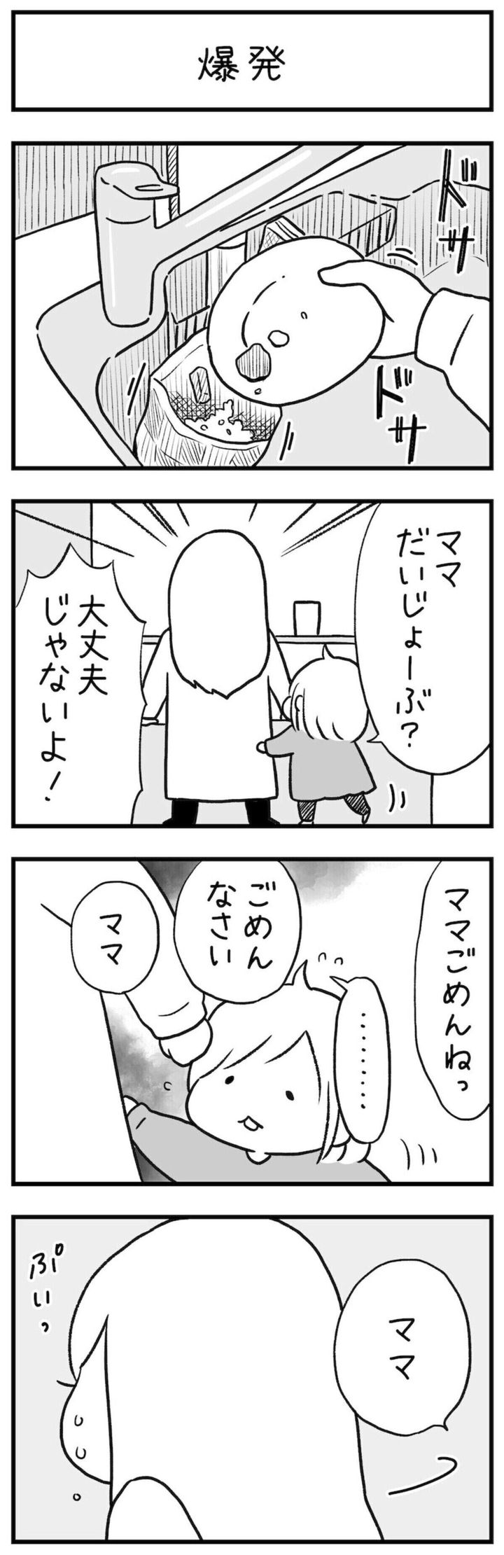 やき子さんのストレスと悲しみは限界に達し「もうママういちゃんにごはん作りたくない…」と泣きながら片付けを始めます。いつもと違うママの様子に、ようやくういちゃんにも気持ちが通じたのか、「ママごめんね」と必死に謝りました。