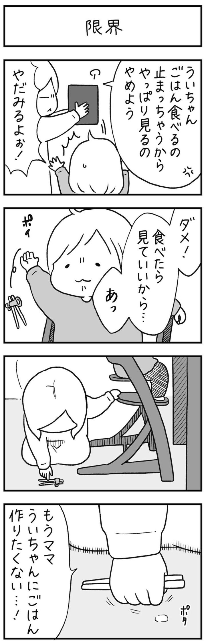 「ごはん食べるの止まっちゃうから見るのをやめよう」とタブレットを閉じると、ういちゃんはお箸を床に投げ捨ててしまいました。