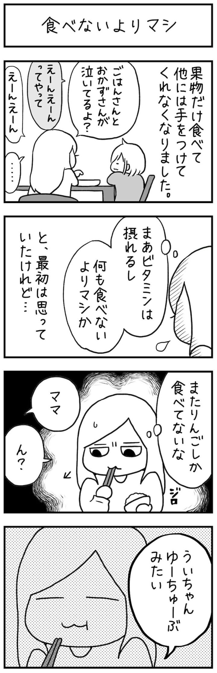 子どもが成長するにつれて食べられるものが増えるとうれしい反面、好き嫌いや偏食に悩まされることも。「あれもこれも食べない」という事態になれば、食事の時間がストレスになってしまうこともあるでしょう。アメーバ公式ブロガーとして活躍するやき子さんの娘・ういちゃんは、なんと果物しか食べなくなってしまったそう。そんなういちゃんに何とかごはんを食べさせようと奮闘するママの姿を描いたやき子さんの漫画『ごはんの時間が楽しくない』をダイジェストでお送りします。