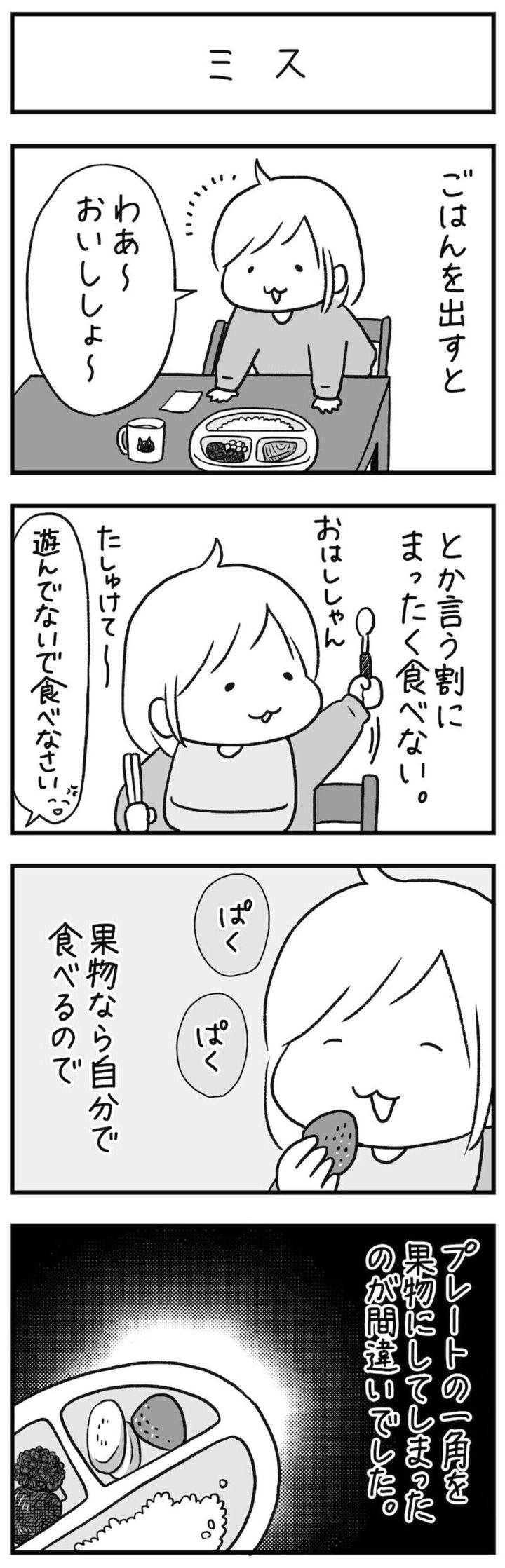 「少しでもおいしく食べてほしい」という思いのもと、現在は少なめに盛り付けることや、ごはんを残したらおやつをあげないなどのルールを作り、あとはおおらかに見守るようにしているというやき子さん。同じように子どもの偏食に悩む方にとっては共感でき、学びが多くありそうな漫画エッセーでした。