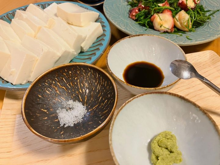 これまでパックから出して、水切りをして、切って、それぞれのお皿にのせて、鰹節をかけた状態で食卓に並べていた冷や奴。最近は、水切りして切った冷や奴を大皿へ出し、一緒に調味料も食卓に並べています。