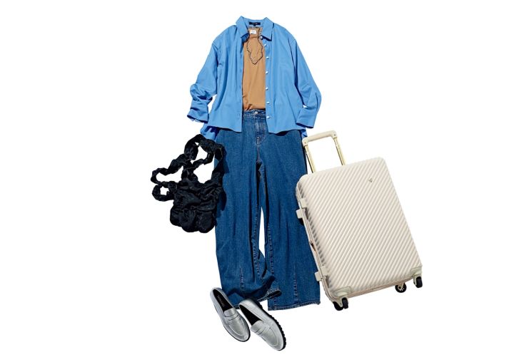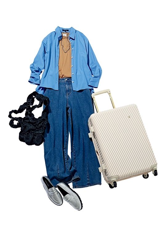 ボウタイ付きシャツ¥22,000/アンタイトル キャメルカットソー¥9,900/IKITSUKE(IKITSUKE笹塚店) カーブデニムパンツ¥22,990/リネイヴ(オンワード樫山) ギャザーショルダーバッグ¥5,940/キャセリーニ ローファー¥39,600/ブランベール(ウールン商会) ネックレス¥2,800/ミーティア(ロードス) キャリーケース¥40,700/ジュエルナローズ(ジュエルナローズ新宿ミロード店)