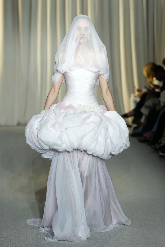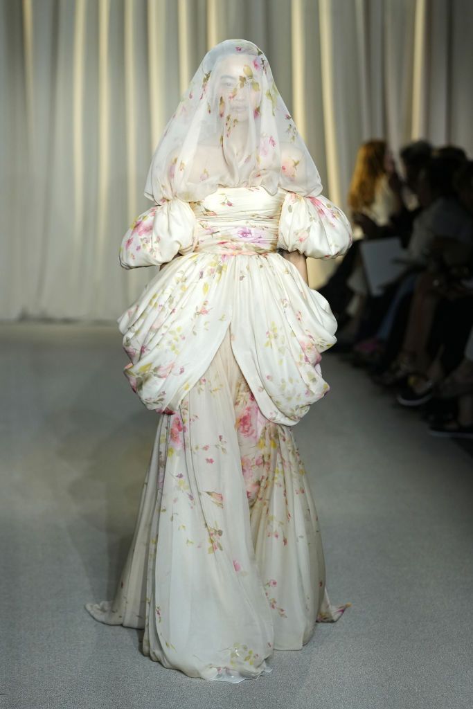 まるで雲のようなペプラムが目をひくシフォンドレスは、バルーン状に膨らんだベールもロマンチシズムを感じさせます。今回のコレクションでは、マリーゴールド、シャクヤクなどの花モチーフやインドを思わせる色鮮やかなドレスも登場しました。