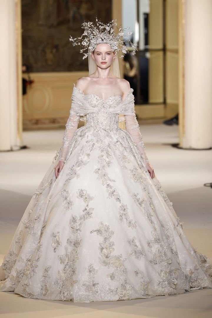 中東発クチュリエらしい、壮麗な世界観がエレ派のおしゃれ心をくすぐるトニー・ワード。きらめきを放つデリケートな刺しゅう、セミシアーなショールスリーブがエレガントなドレスは、華やかなバンケットに映えること必至。ヘッドピースもインパクト大です。