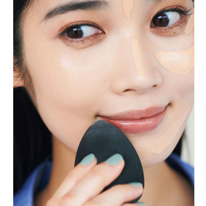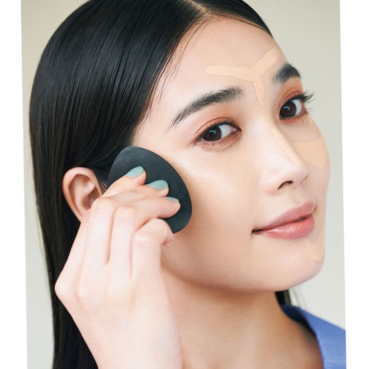 小顔にしたいときは下のパーツから引き上げていくのが◎。水スポンジであご→耳に向かってラインを広げすぎずにぼかします。
