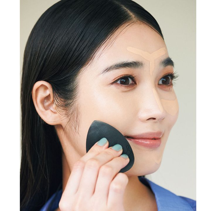 水スポンジで頬からこめかみに向かって広げすぎずにぼかします。頬の高い部分を明るく補整することでリフトアップ&美肌印象が!