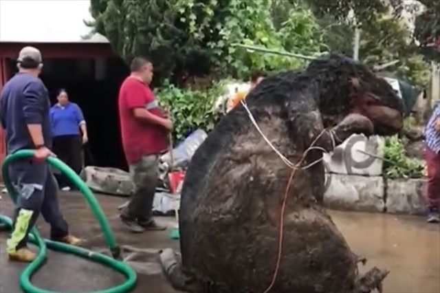 下水も詰まってしまったため、下水の清掃もしていたそうなのですが・・・、その際に出てきたのがこの巨大なネズミだったといいます。 高さは人間の大人ぐらいあって、横幅もなかなかのもの。 人々はホースで水をかけて汚れたネズミを洗っていますが、あまりの大きさといい姿勢といい、ちょっと不自然なものがあります。