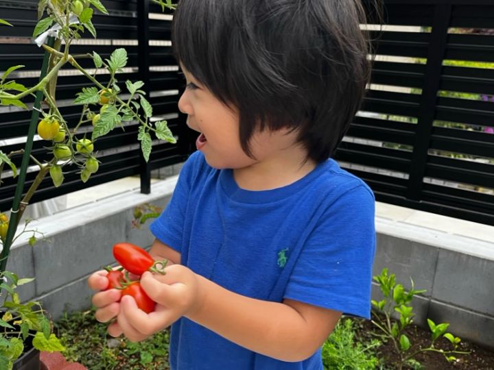 家庭菜園しているミニトマト♡実がなって、赤くなってくるのを親子で観察するのが日課です!