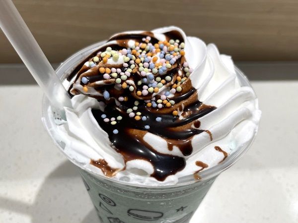 マックのフラッペと聞くとかなり甘そうなイメージですが、一口飲んでみるとかなり爽快感が強くてスッキリ! スースーとした清涼感がとても心地よく、意外にもゴクゴク飲めます。フラッペの中でもオレオクッキーの風味もしっかり感じられ、全体のバランスが◎。