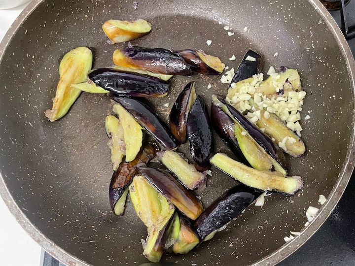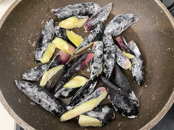 3. フライパンを中火にかけ、油小さじ2(分量外)を引いたら2のなすを入れます。